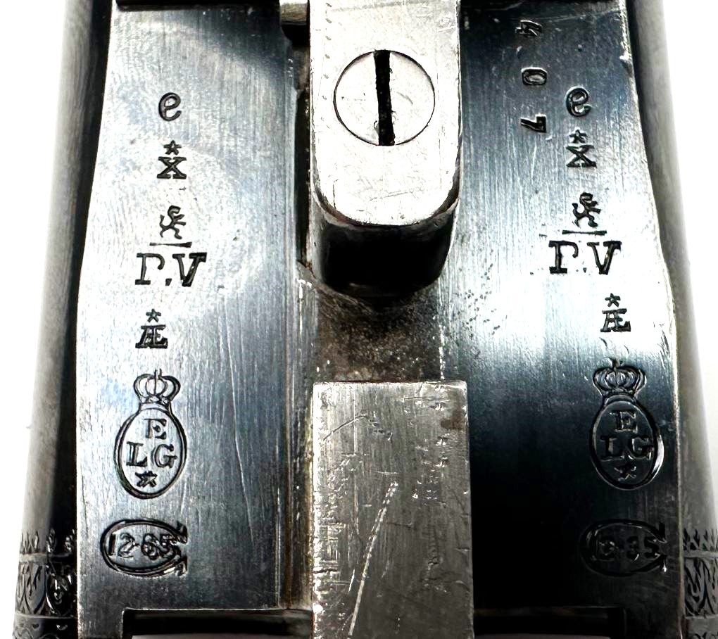 LV couronné : sauf erreur, il pourrait s’agir de Louis VENDRIX (BE 1907/1937) qui en toute hypothèse aurait fabriqué l’arme pour le compte de LEPAGE ? (Voir site)