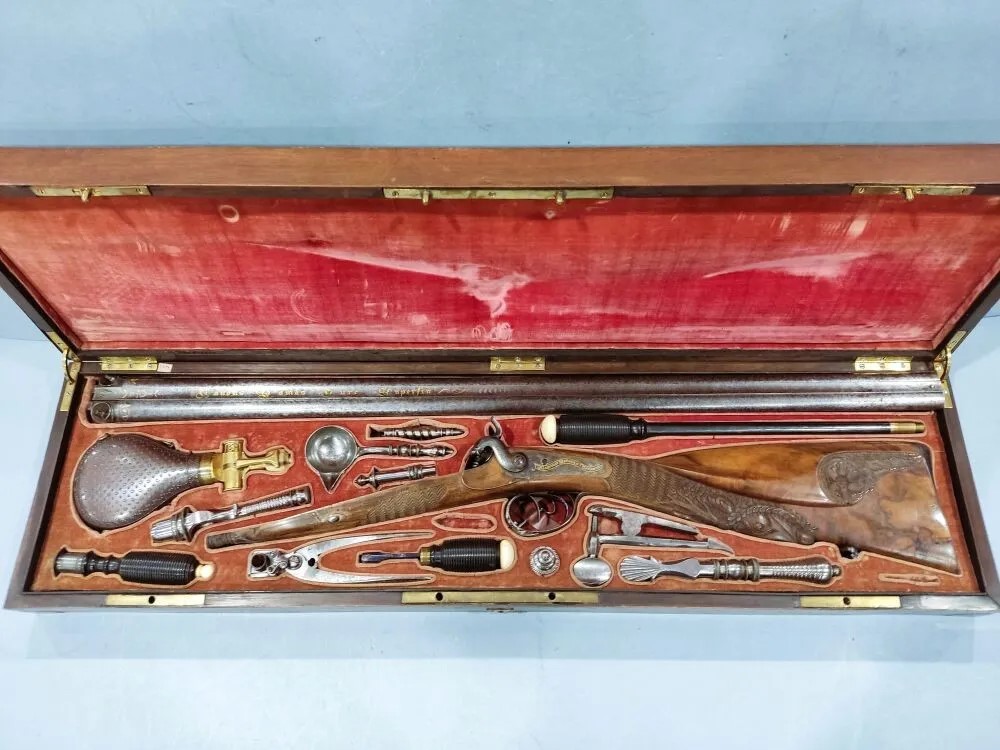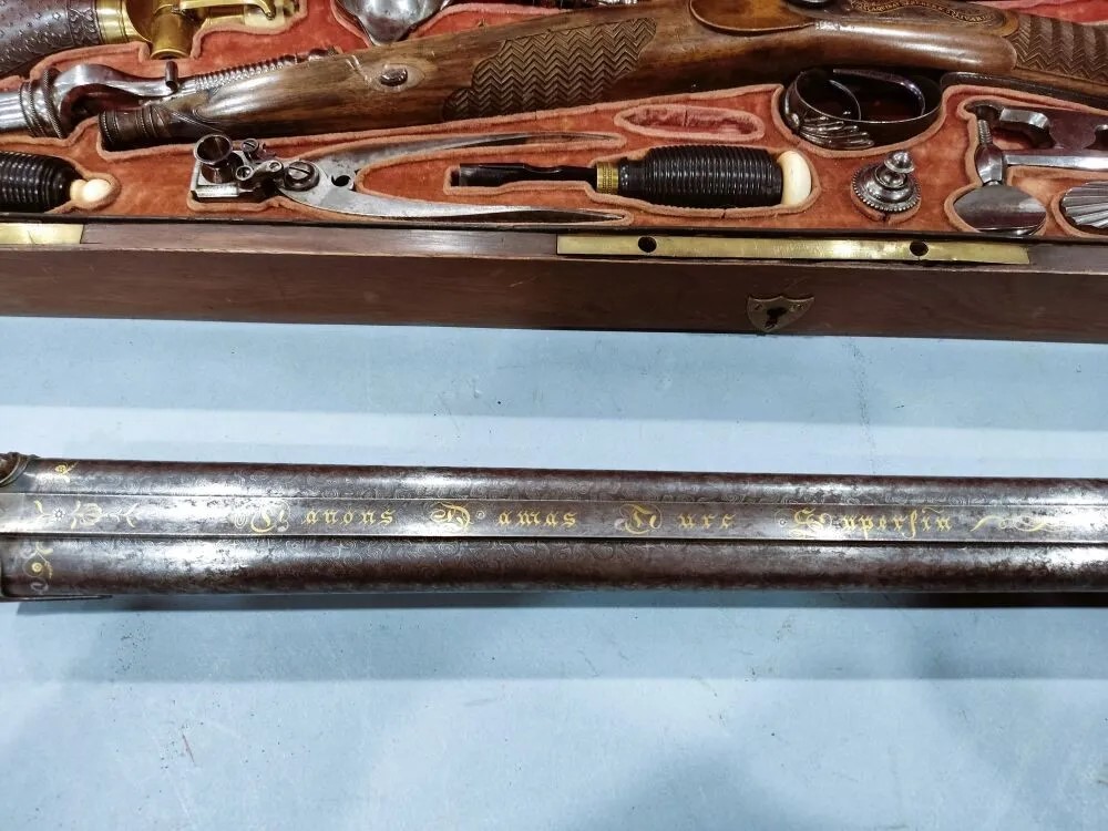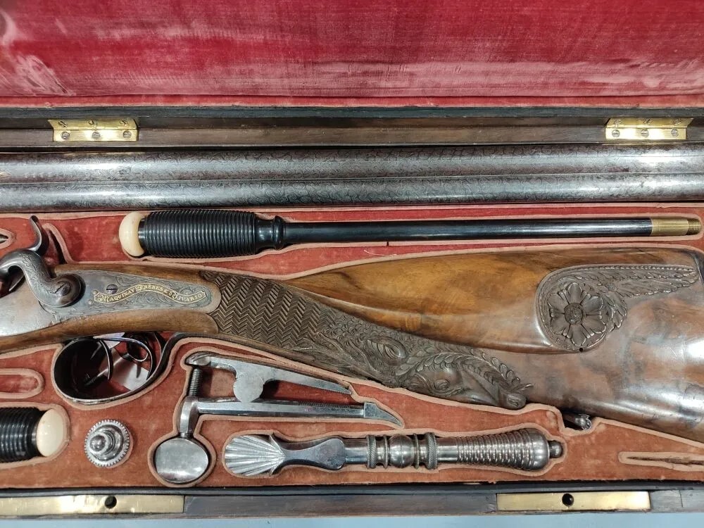 de la chasse au cerf, platines en acier bronzé marquées à l'or "Maquinay Frères
