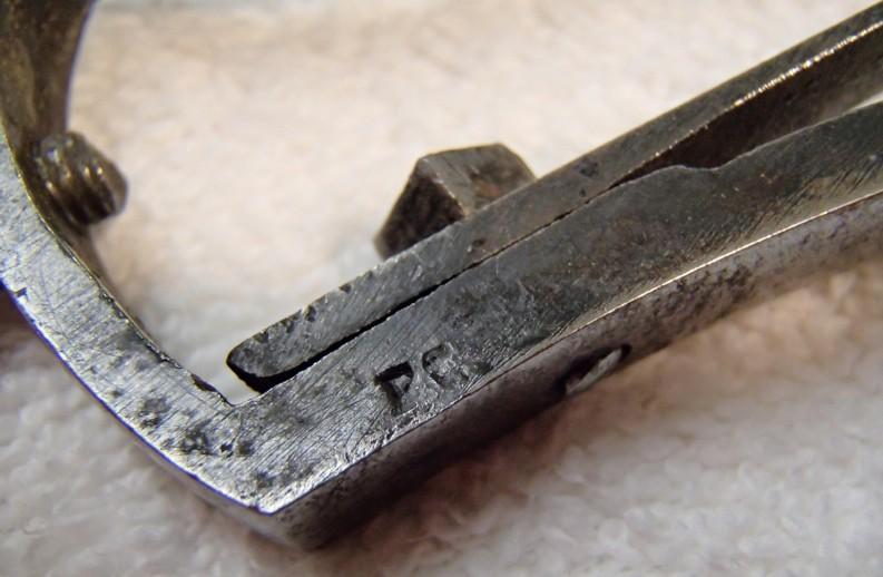 VP dans un cercle : cette marque de fabricant ne figure dans aucun recueil, la recherche (prénom – nom) n’a donné aucun résultat. Mais la recherche (nom-nom) nous fait découvrir (en toute hypothèse ?) le nom de Vivario-Plomdeur Nicolas, inscrit au banc d’épreuves de Liège de 1836 à 1863 soit tout à fait dans la période de la présente arme. Il est l’auteur de 4 brevets portant sur les revolvers de 1859 à 1868.Cela restera à confirme ou infirmer sur une autre arme ?