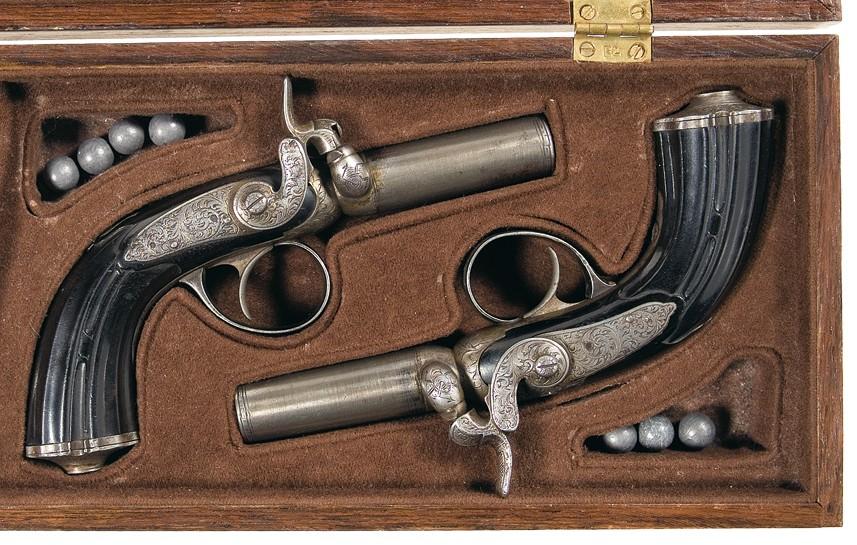 Cette boite consiste en deux pistolets belges à percussion, identiques, gravés et bordés d’insert en or.