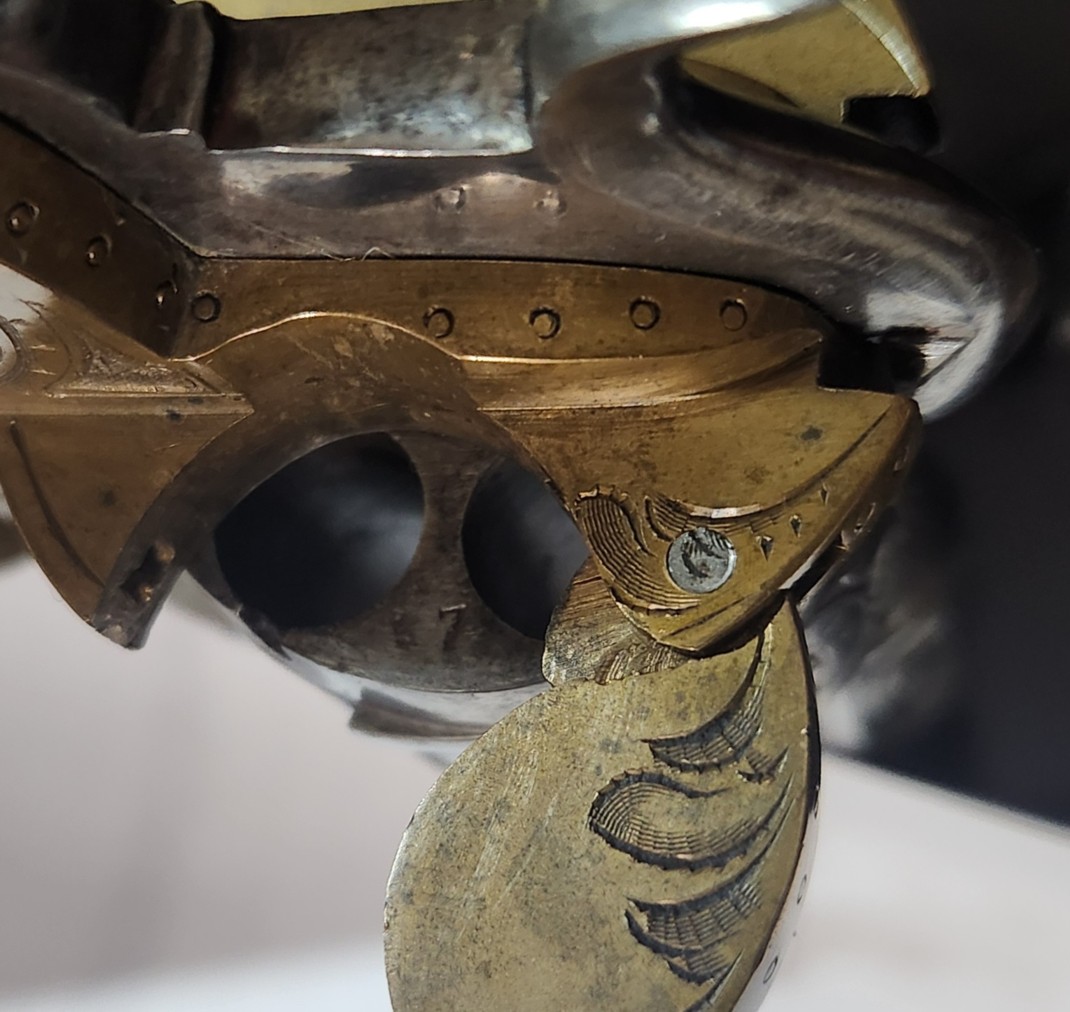 The number "1" is marked on the barrel underside and breech plug. The frame, lock plate, hammer, trigger guard and buttcap feature an extensive scroll engraving with a unique circle and arrow pattern engraving on the bolster.