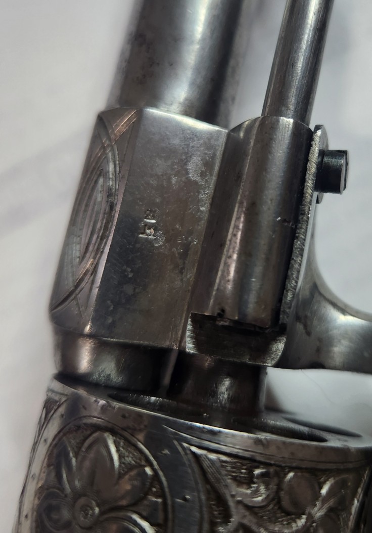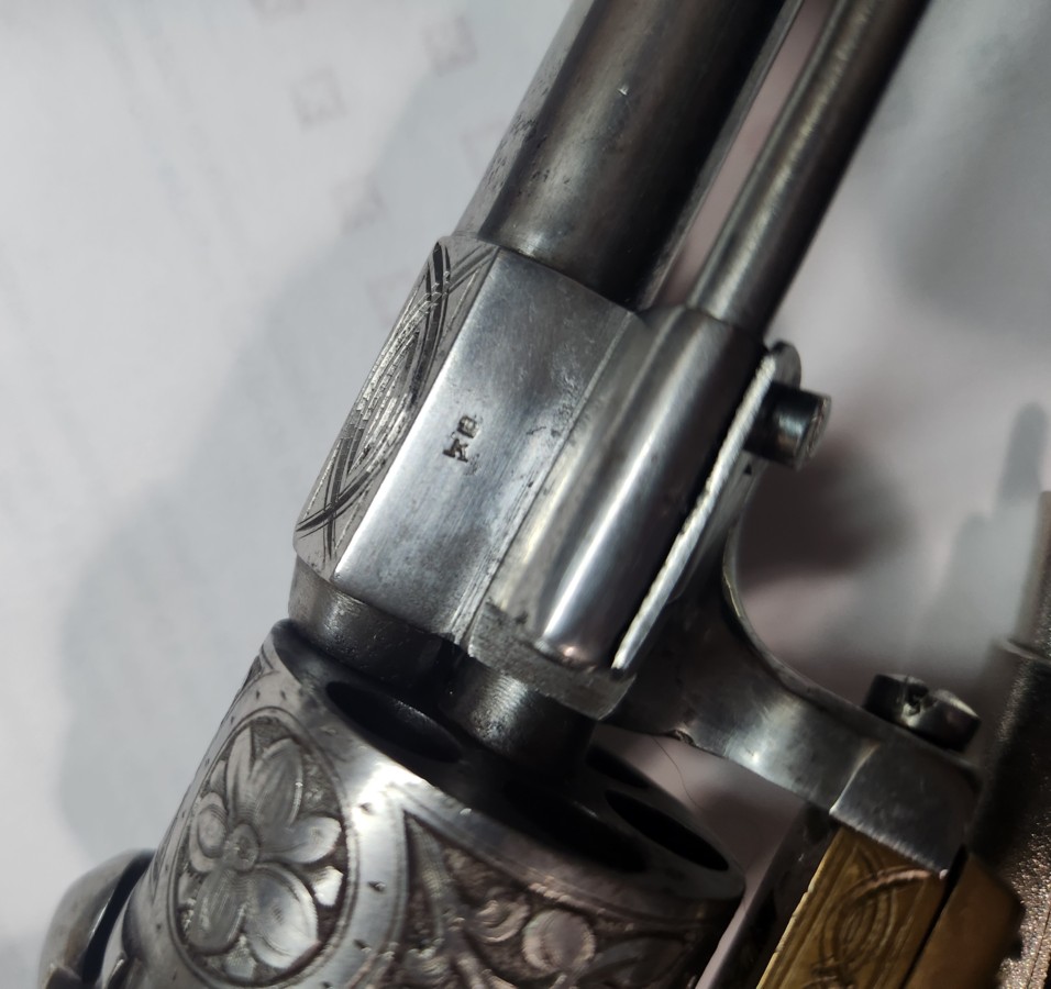 nice Lefaucheux-type revolver in 9mm pinfire caliber. It has a copper-colored