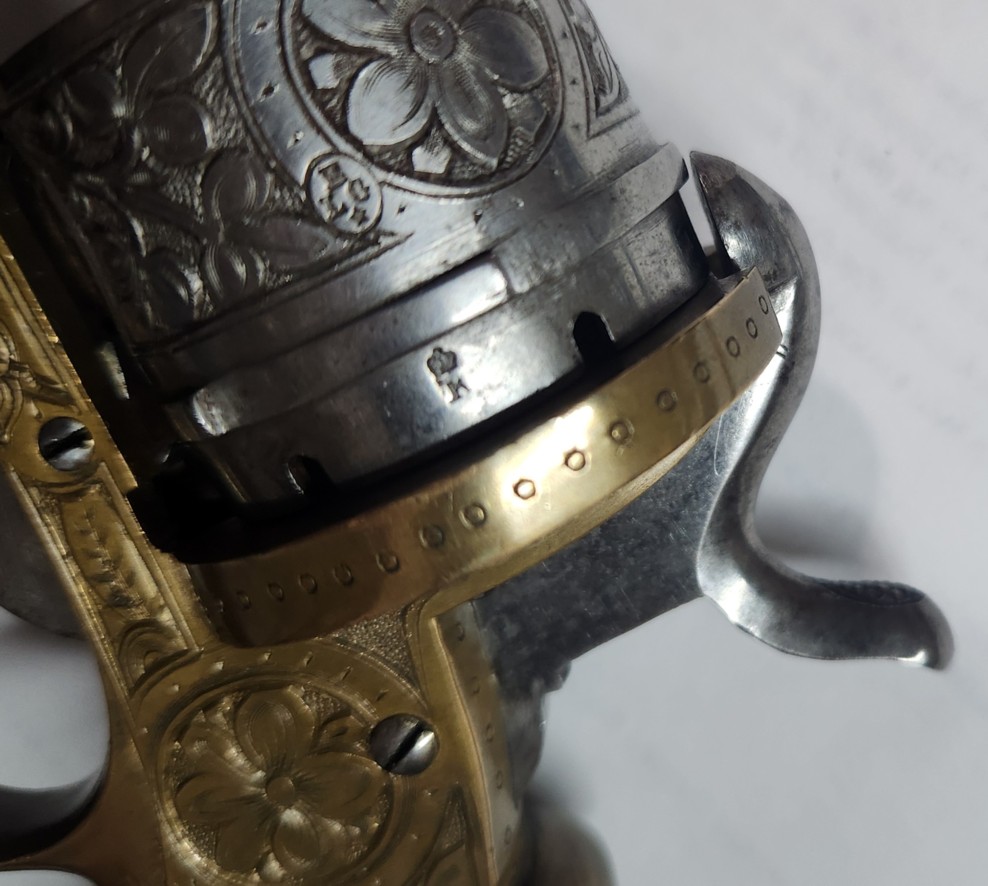VP in a circle: this mark of manufacturer does not appear in any collection, research (first name - name) did not give any result. But does research (name-name) make us discover (in any assumption?) the name of Vivario-Plomdeur Nicolas, registered with the proofhouse of Liège of 1836 to 1863 is completely during the time of this weapon. He is the author of 4 patents relating to the revolvers of 1859 with 1868. That will remain with confirms or to cancel on another weapon?