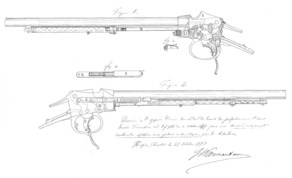 Cette arme a été inventée par Julien WARNANT-CREON de CHERATTE (Liège) et le brevet déposé le 23.03.1885 (voir dessin technique en annexe).