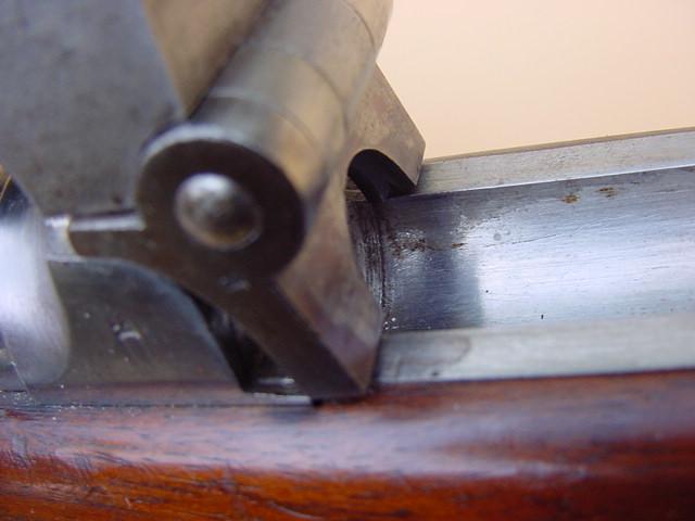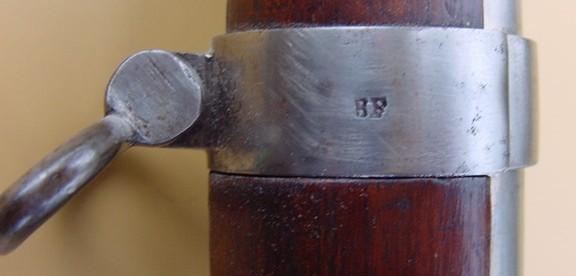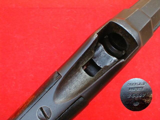 The octagonal part of the barrel displays maker's markings, "Beuret F..., Liege". The right side of the receiver displays wording, "Comblain Brevete", over a number of unknown meaning, "24647". The Liege proof marks are stamped on major steel parts of the carbine. Several other Belgian marks and proofs are stamped on the various parts of the carbine. The bayonet lug for the saber type bayonet is located on the right side of the front barrel band.