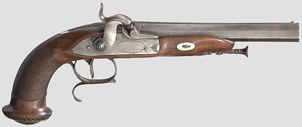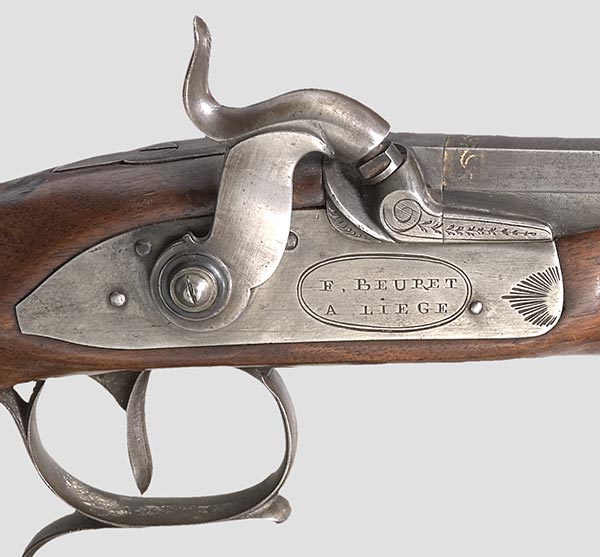 F. Beuret, Liege about 1830. Octagonal barrel -caliber 14 mm with remainders of gold inlays on the chamber. Percussion Lock engraved with the signature “F. BEURET A LIEGE”.
