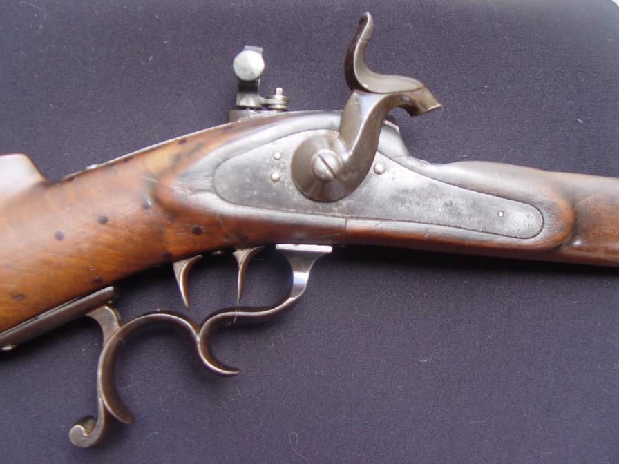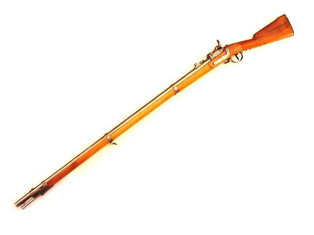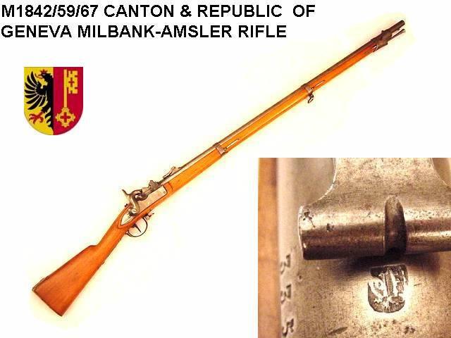 EXCELLENT M1842/59/67 MILBANK AMSLER RIFLE WITH CANTON GENEVA PROPERTY MARK. THIS BELGIAN MADE M1842 PERCUSSION MUSKET RECEIVED RIFLEING AND A REAR SIGHT IN 1859. CONVERTED TO A 18x25mm RF MILBANK-AMSLER SWING BLOCK BREACH LOADER IN 1867. CARTOUCHE ON THE SWING BLOCK: MASSIP & THURY. OAL=147cm.