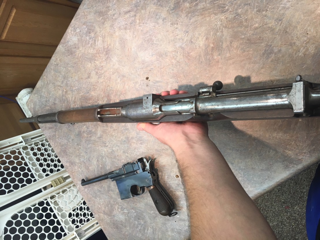 skermishes. The return spring housing is in line with the barrel, behind the