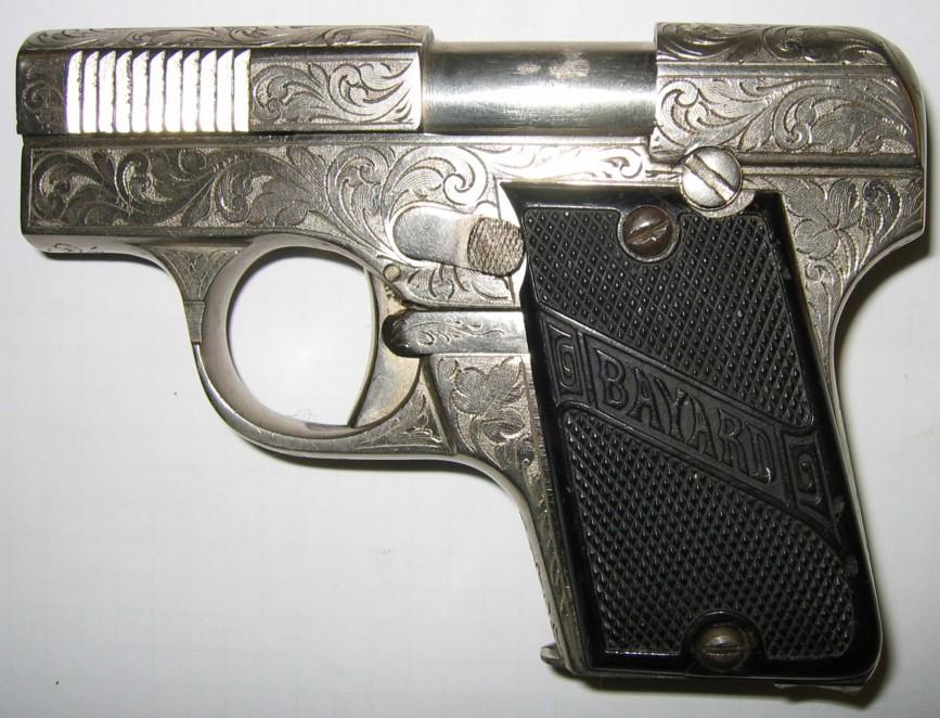 It is about a rare Francotte pistol model E in calibre6.35mm, manufactured between 1912 and 1914, and furnished of plates borrowed from Bayard. In theory those should raise an escutcheon with the letters A and F.
