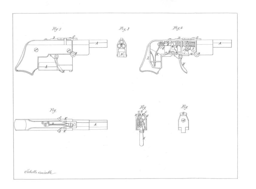 It acts of a gun of pocket of the hammerless type to rotary strikers comprising 4 barrels of calibre 22. The crack of the guns for the loading and unloading is done thanks to a key located above the frame. The block-barrels swivels then on an axis located at the bottom of the carcass. The trigger without trigger guard is folding. The moulded and worked grips seem to be in horn or gutta-percha about it.