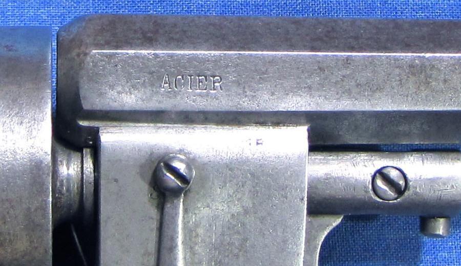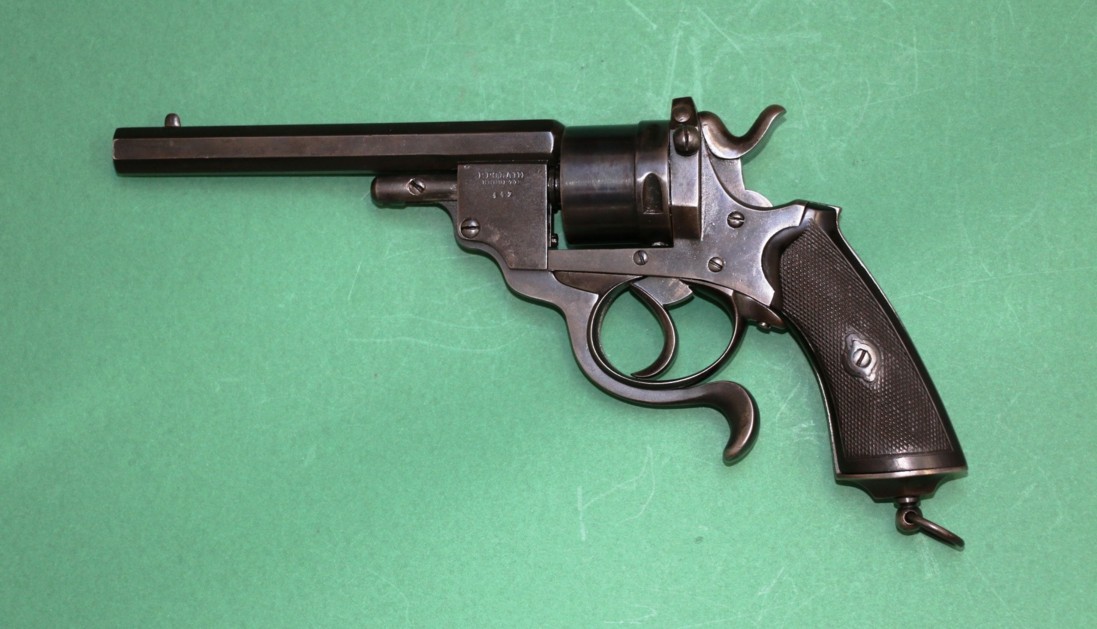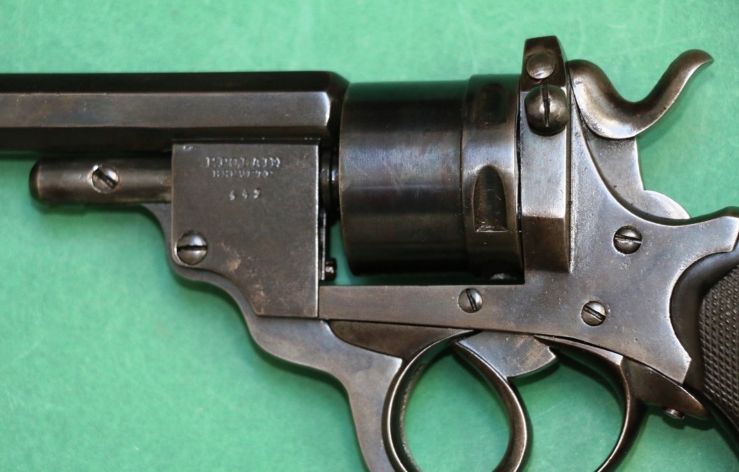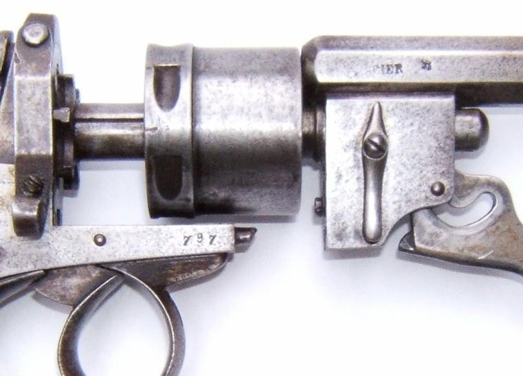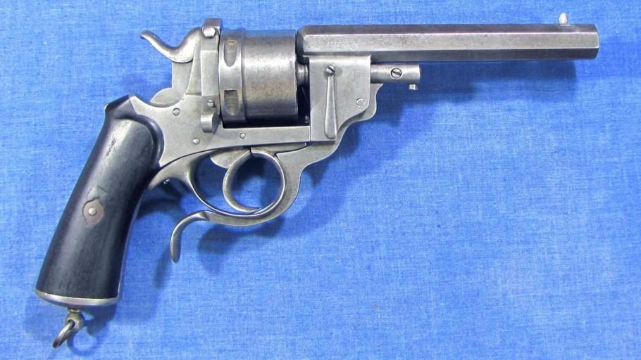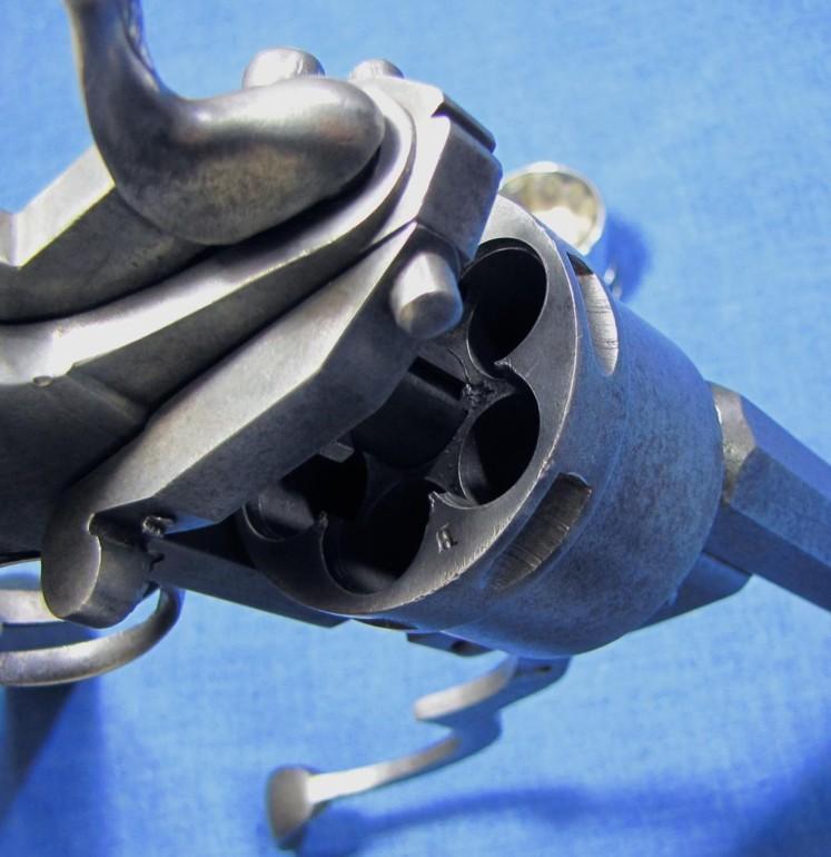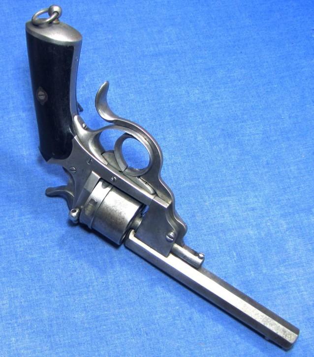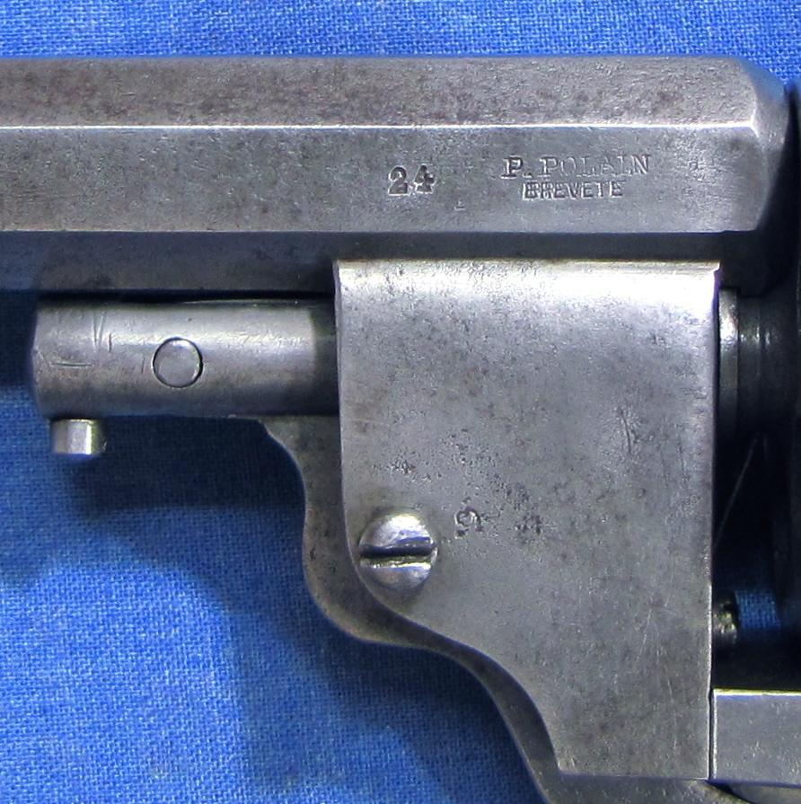 Voici un revolver à percussion centrale de Polain Prosper avec un canon et barillet coulissant. Dans la mesure où je peux le savoir, c'est le model 1869. Quand la portière de chargement est soulevée vers le haut, le barillet est libre en rotation. Son calibre est de 9.3 millimètres et a 4 rayures, tournant à droite. Longueur de canon 145 millimètres, longueur totale 268 millimètres.