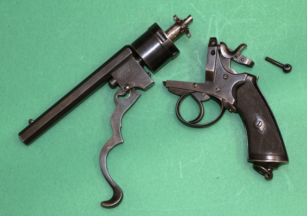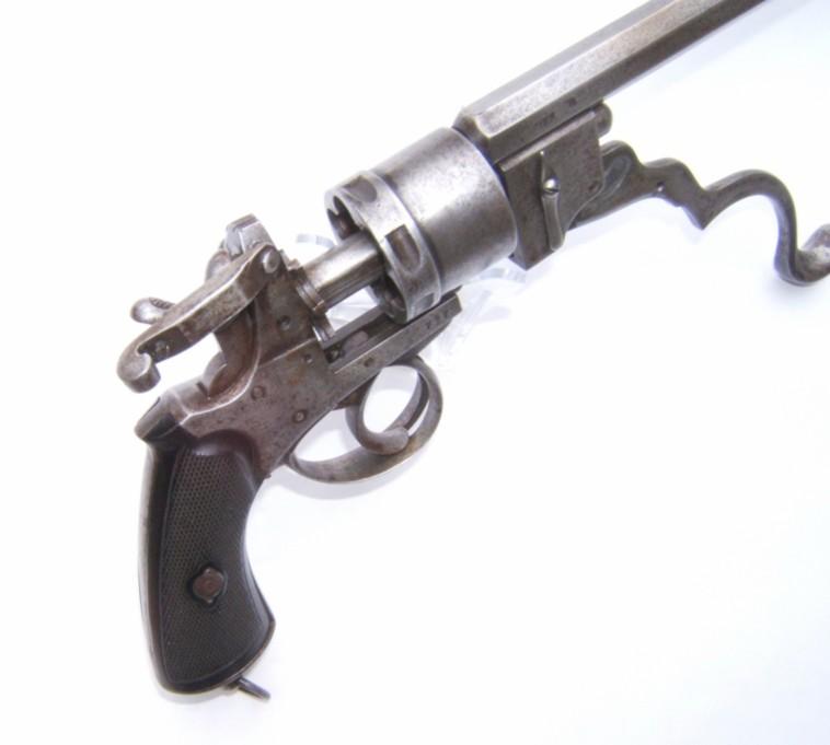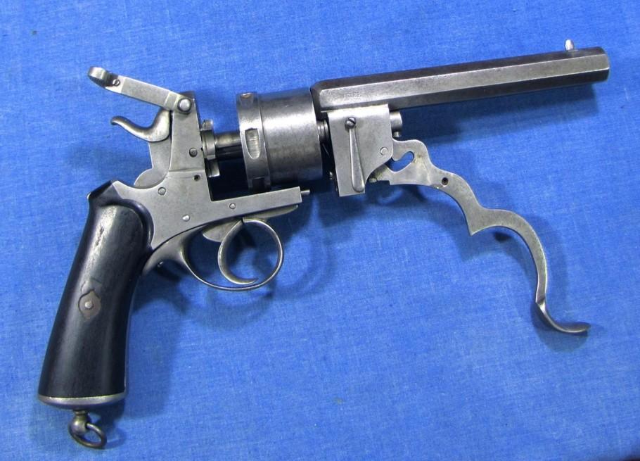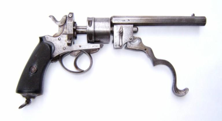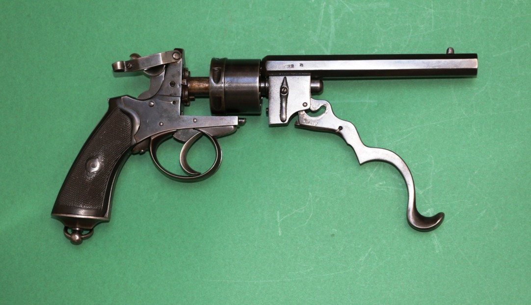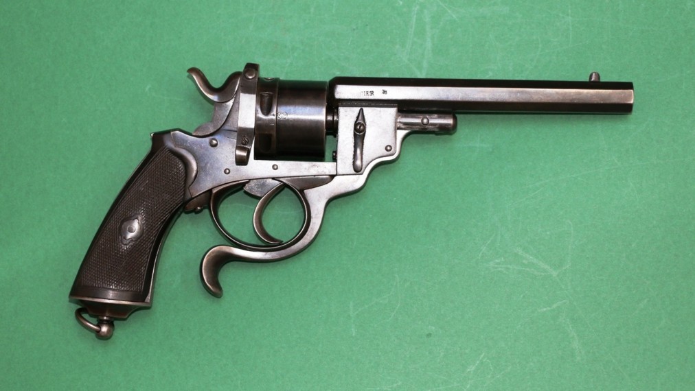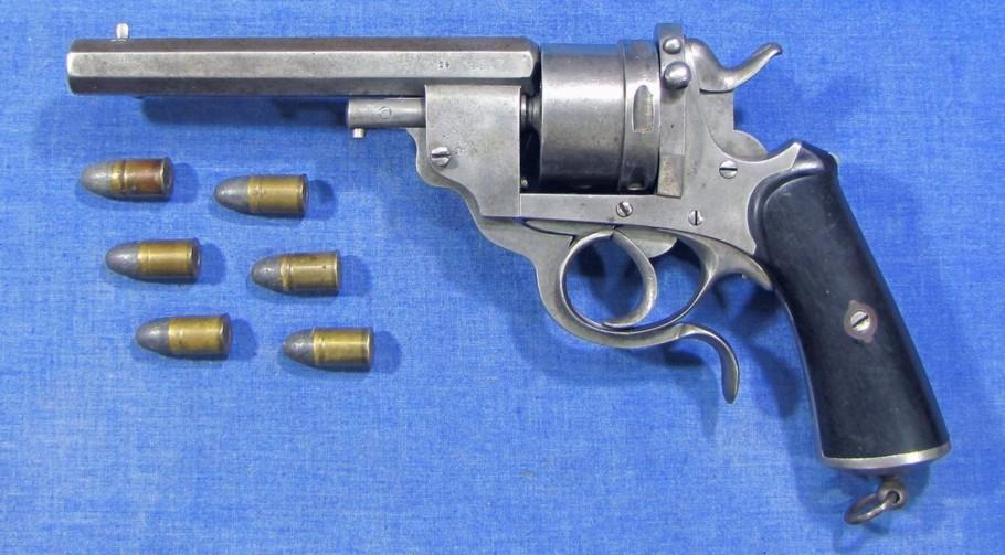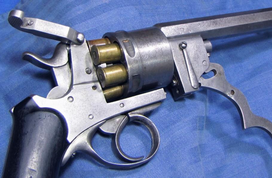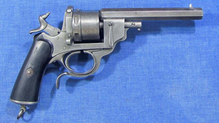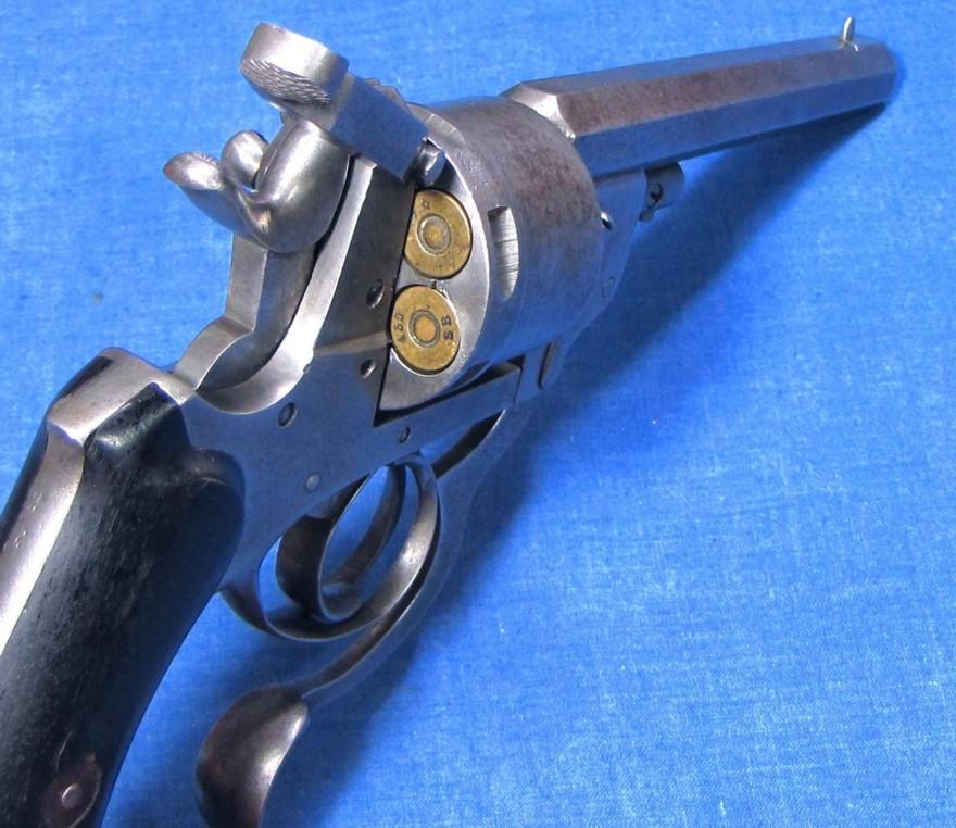 Il s’agit d’un revolver à percussion centrale et cadre ouvert en simple et double action. Le canon et le cylindre avec extracteur sont glissants. Un levier articule se rabattant sous le pontet, entraîne, lorsqu’il est actionné, canon et cylindre qui glissent sur le prolongement de l’axe. L’extracteur en étoile reste fixé à la culasse. Lors du mouvement, les cartouches sont retenues et éjectées automatiquement. La portière en s’ouvrant en arrière et vers le haut, place le chien en position de sûreté. Cette arme a fait l’objet du brevet n° 29389 du 26.09.1871 pour des perfectionnements aux armes revolvers et fusils se chargeant par la culasse. L’arme est d’une capacité de six coups, le canon à 8 pans comporte 7 rayures tournant vers la droite. Le calibre est du 450. Les plaquettes de crosse sont en bois noirci, réunies par une vis et deux rosettes à oreilles. Cette crosse se termine par une calotte métallique avec vis-pivot et anneau.