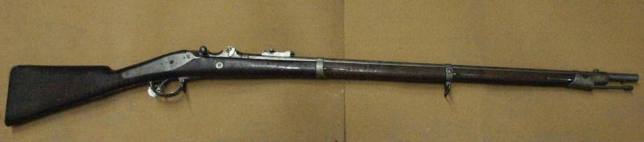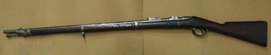 It acts indeed of the rifle of infantry Mle 1853-1867, manufactured since 1867 and resulting from the transformation of a ml 1853 with system ALBINI-BRAENDLIN with loading by the cylinder head. One could adapt a bayonet model 1777-1867 to it shortened for the police force of Belgian Congo.