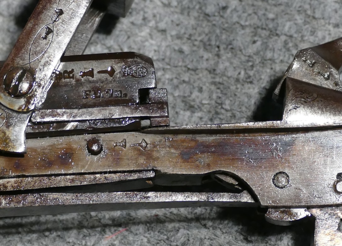 The presence of this Dresse-Laloux logo, registered in 1881, raises questions about a weapon whose design clearly predates it by a century. Research by several members of the team points toward a Prussian origin. Indeed, the initials SD could be the signature of the Splitgerber & Daum firm, which existed under this name from 1722 to 1779. It could therefore be a weapon recovered from a stockpile, retested in Belgium before being resold by Dresse-Laloux in a region of the world that still used flintlock weapons (Africa?). The Georges Laloux company continued to market these completely obsolete weapons even though it was already established on Rue des Urbanistes. Other examples that have experienced the same situation are known, see for example: