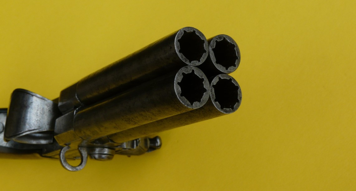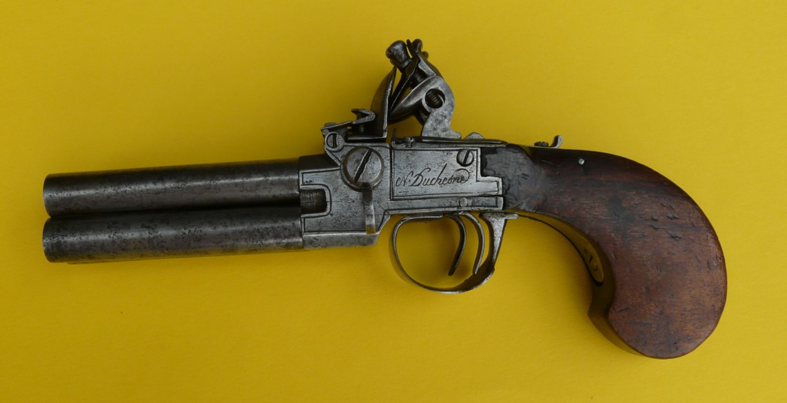 L’arme que l’on peut dater fin 18e début 19e siècle est un pistolet à silex de poche ou de gousset, système à coffre et à deux canons superposées pour un seul chien à gorge ronde et serre-pierre à boule crantée non percée.