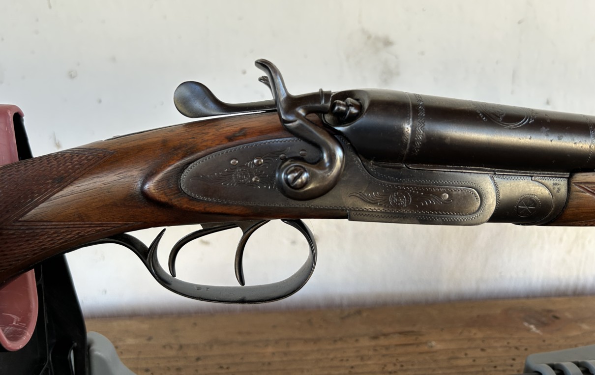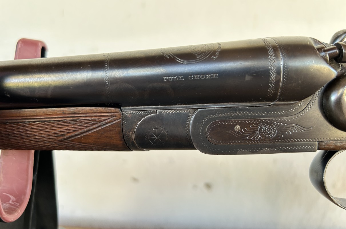 Voici un beau fusil de chasse à deux canons juxtaposés en calibre 16. La platine est à chiens externes (actionnés par deux détentes), avec une clé top lever et une crosse de type pistolet. Les parties métalliques sont partiellement gravées en rinceaux, la crosse et la longuesse sont finement quadrillées. C’est à l’évidence une arme de qualité supérieure et bien conservée.
