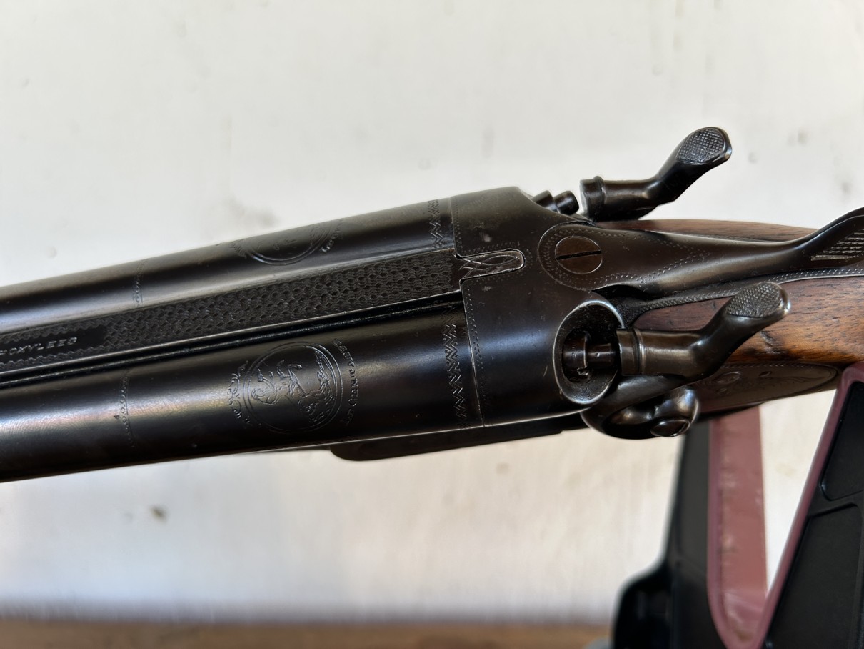 Fusil de chasse à canons lisses et juxtaposés en calibre 12, la platine est de type hammerless à clé top lever et la crosse de type pistolet.