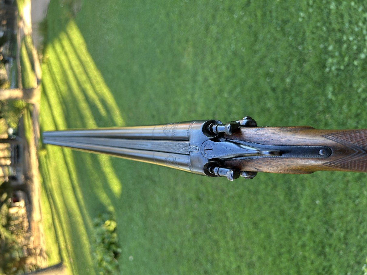 Fusil de chasse à canons lisses juxtaposés en calibre 12, platine hammerless, clé top et longuesse à bouton-poussoir.