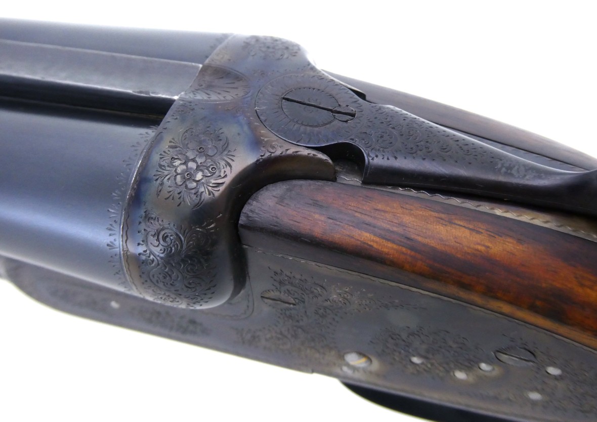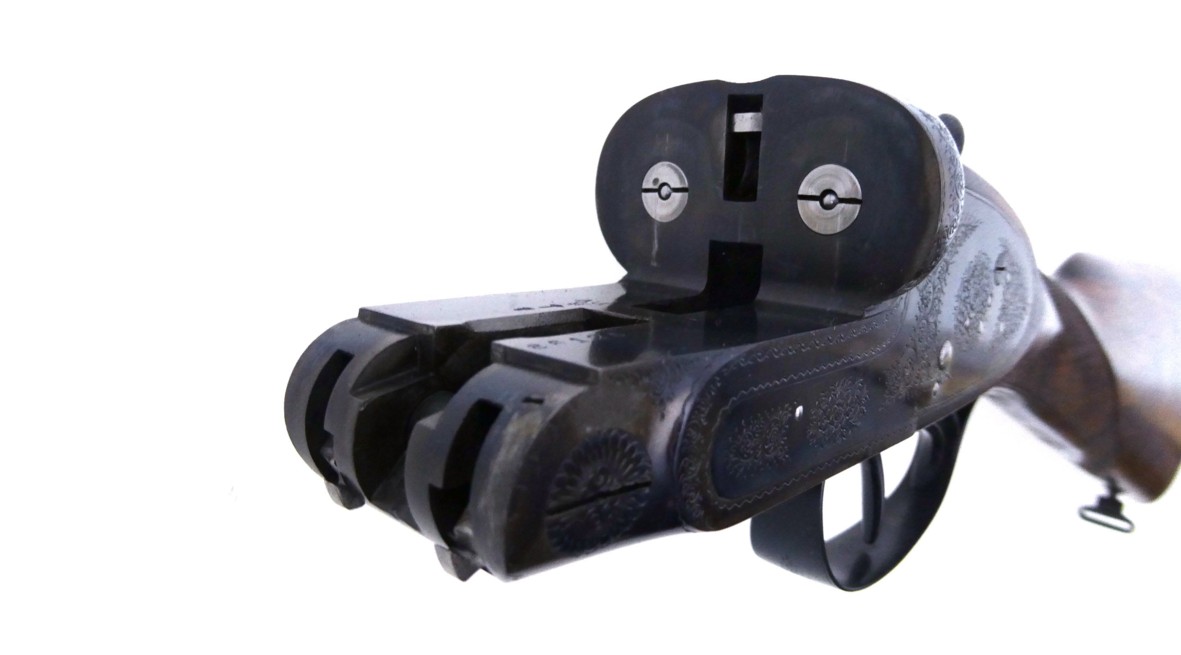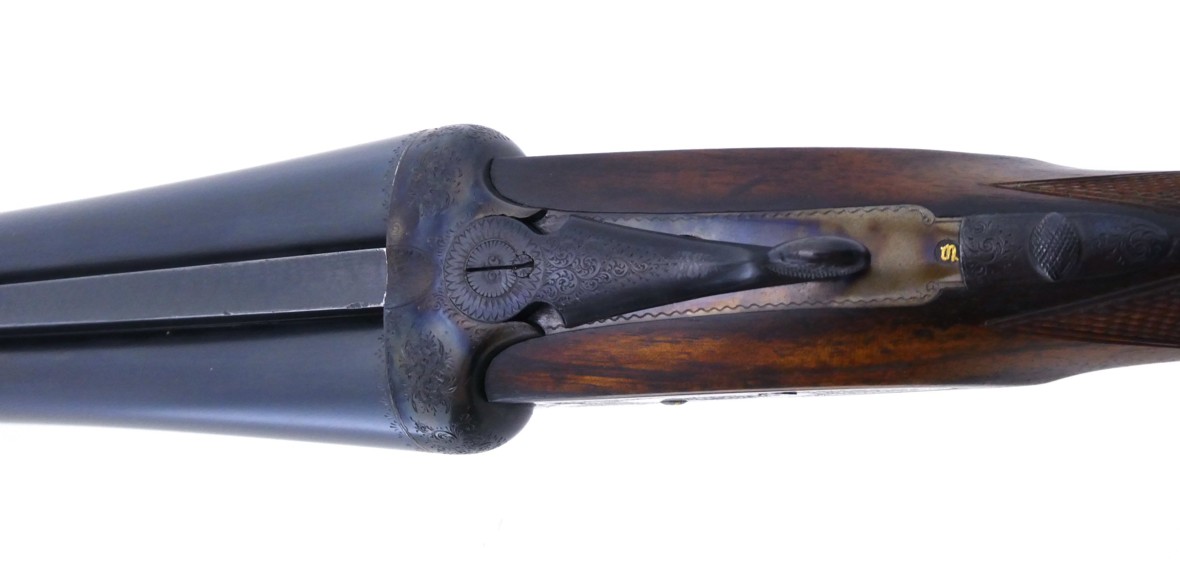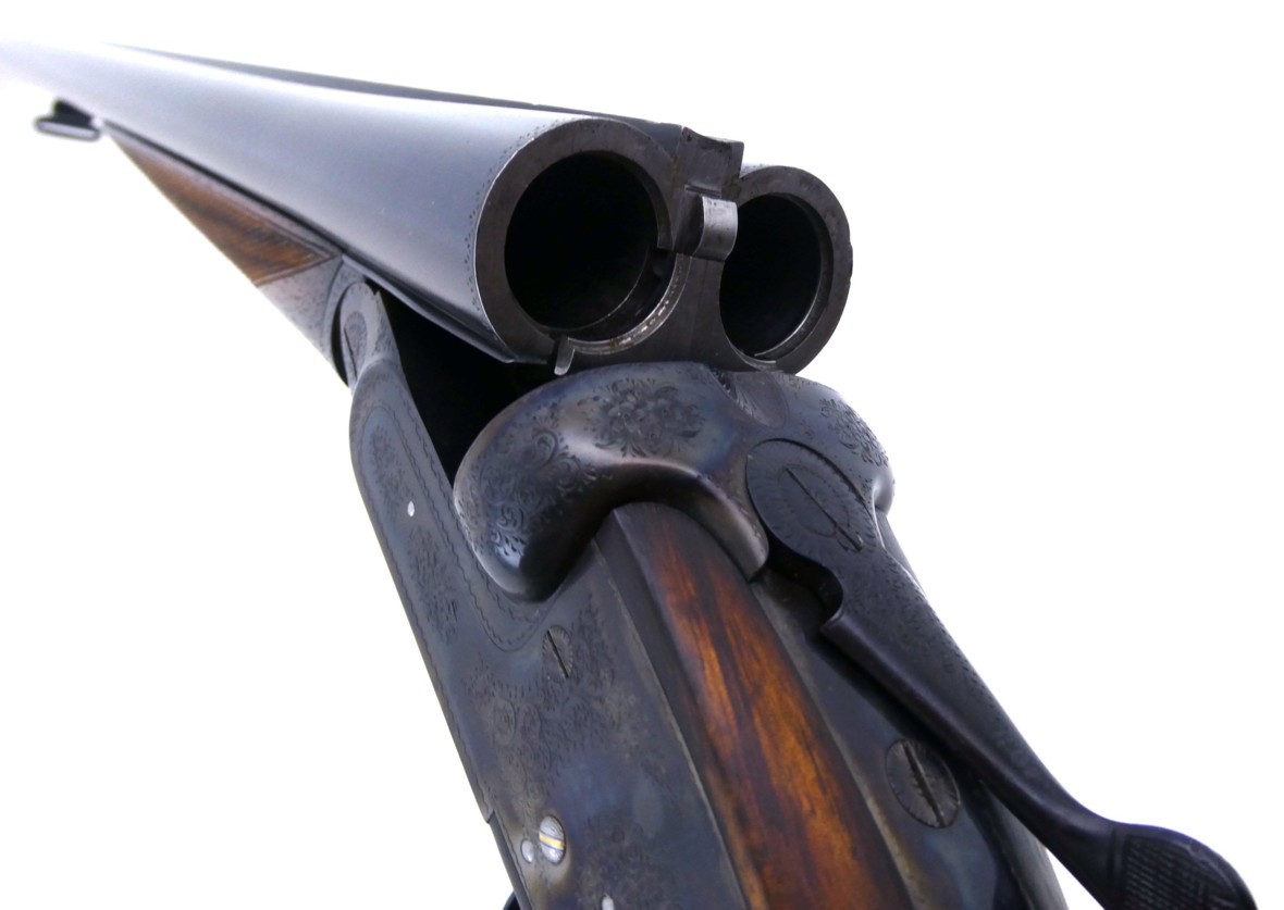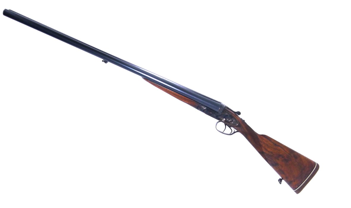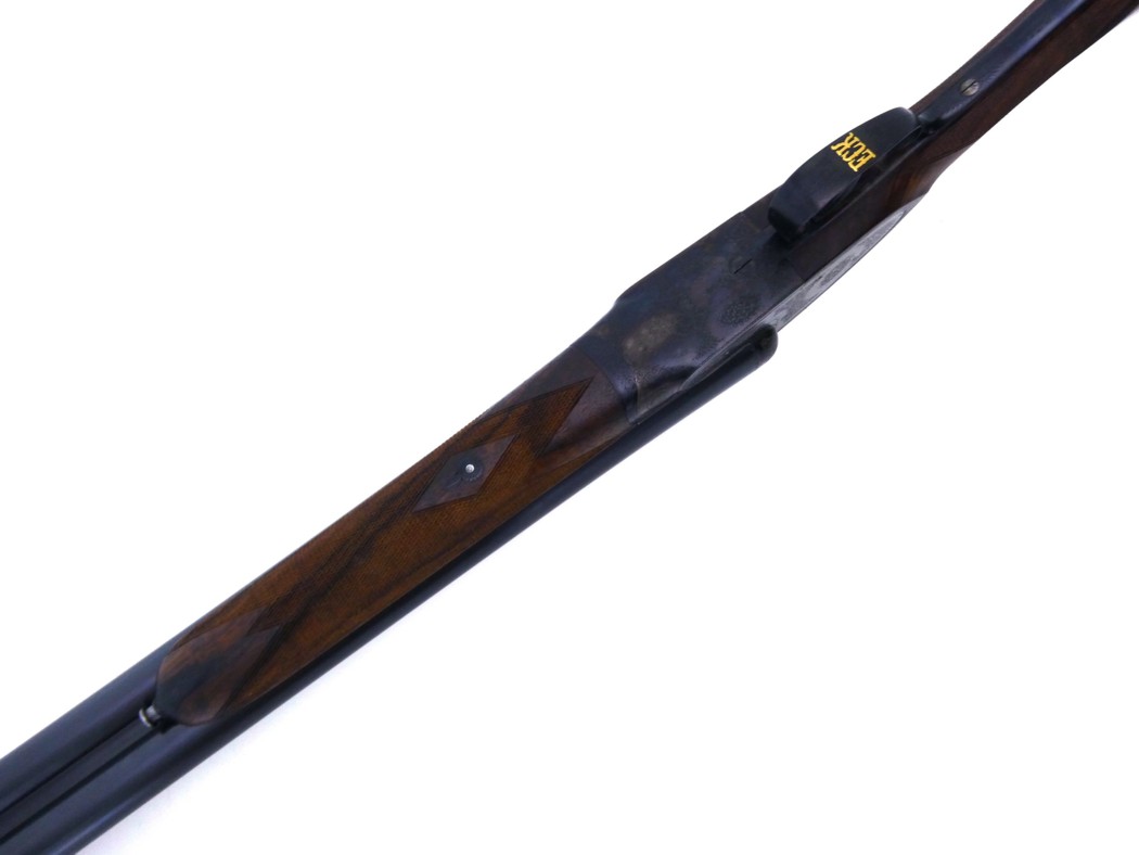 Voici un fusil de chasse juxtaposé à chiens extérieurs, crosse anglaise,