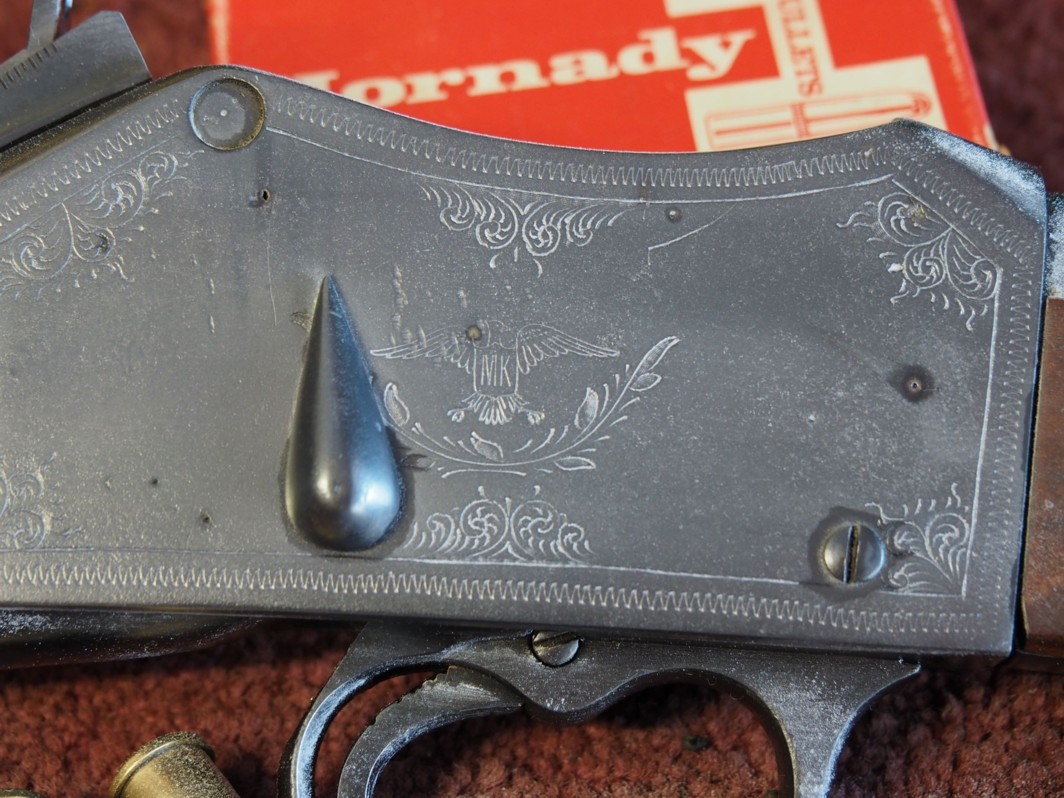 Cartouche monogrammé « MK » dans un oiseau (aigle?), côté droit du bloc-culasse.