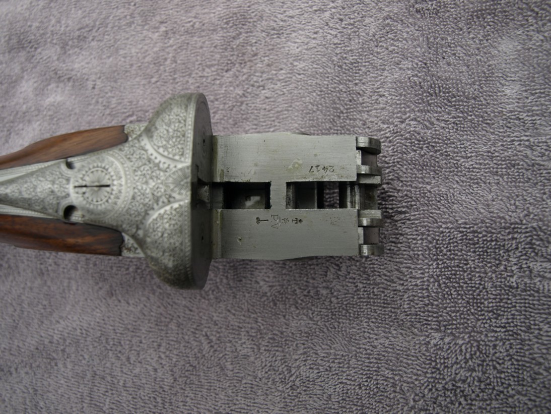 Fusil de chasse à platine carrée hammerless, avec clé top lever. Sécurité derrière la clé.
